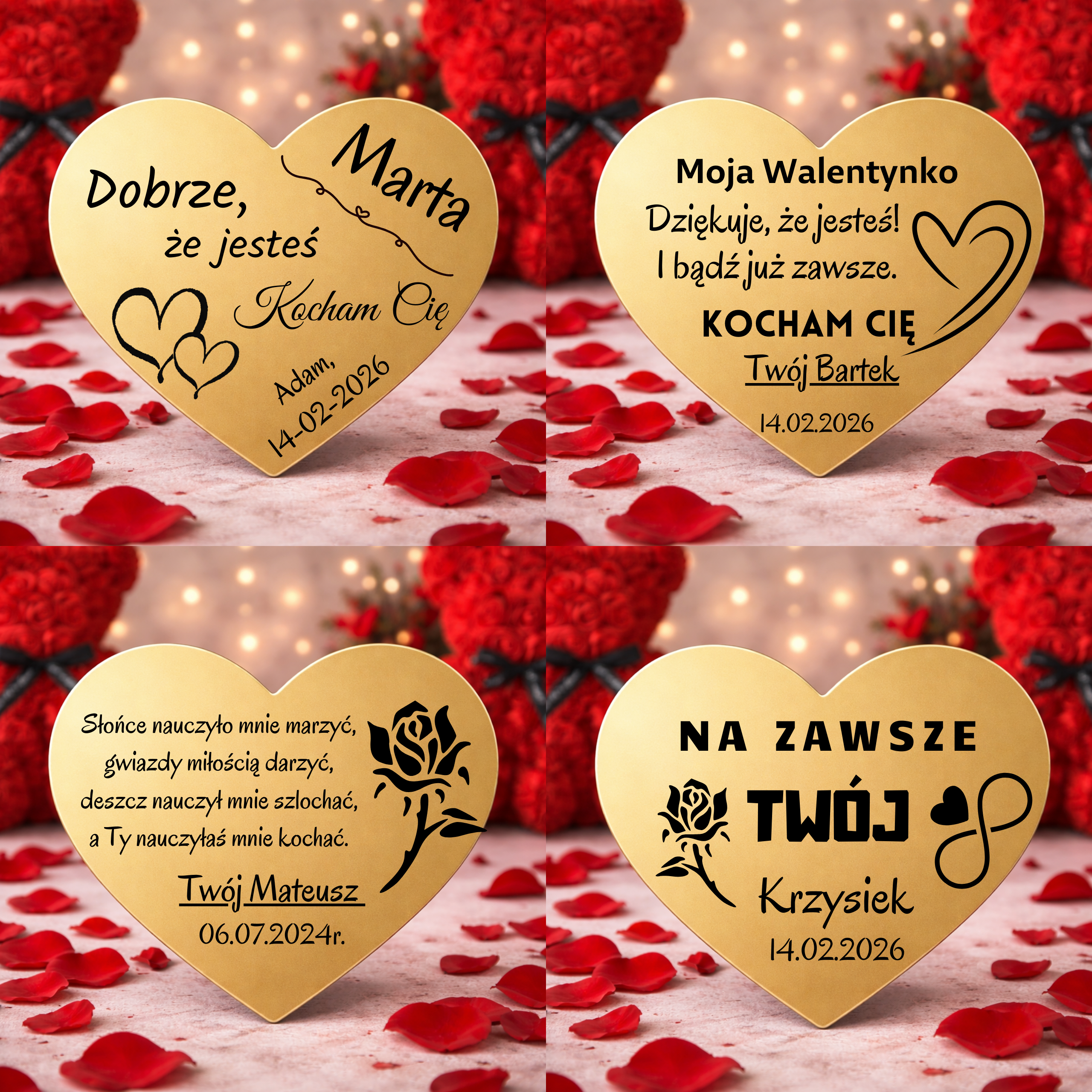 Możesz wybrać jedną z wielu pięknych gotowych dedykacji, albo zapisać na złotym sercu swoje własne słowa – dokładnie takie, jak czujesz.